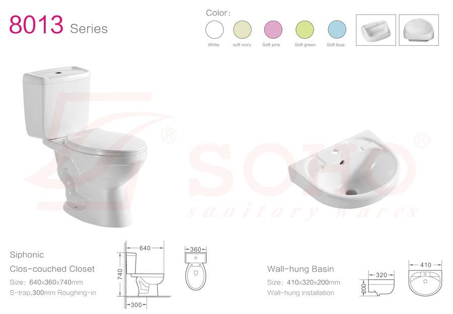 Siphonic Clos-couched Closet 600*370*670MM S-trap:300mm roughing-in Wall-hung Basin 410*365*185MM Wall-hung installation COLOR:White/Soft ivory/Soft pink/Soft green/Soft blue