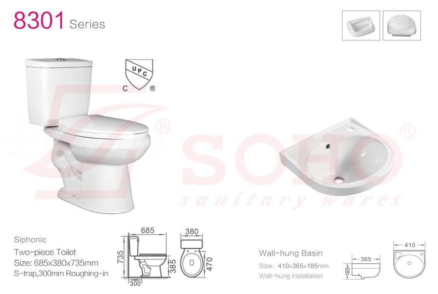 Siphonic Clos-couched Closet 685*380*735MM S-trap:300mm roughing-in Wall-hung Basin 410*365*185MM Wall-hung installation