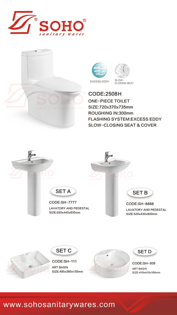 2508H (720*370*735MM) One-piece toilet SET A (550*440*830MM) SH-7777 Lavatory and Pedestal SET B (520*430*800MM) SH-8888 Lavatory and Pedestal SET C (485*380*135MM) SH-111 Art basin SET D (410*410*160MM) SH-309 Art basin