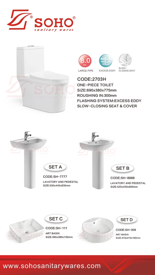 2703H (690*380*775MM) One-piece toilet SET A (550*440*830MM) SH-7777 Lavatory and Pedestal SET B (520*430*800MM) SH-8888 Lavatory and Pedestal SET C (485*380*135MM) SH-111 Art basin SET D (410*410*160MM) SH-309 Art basin