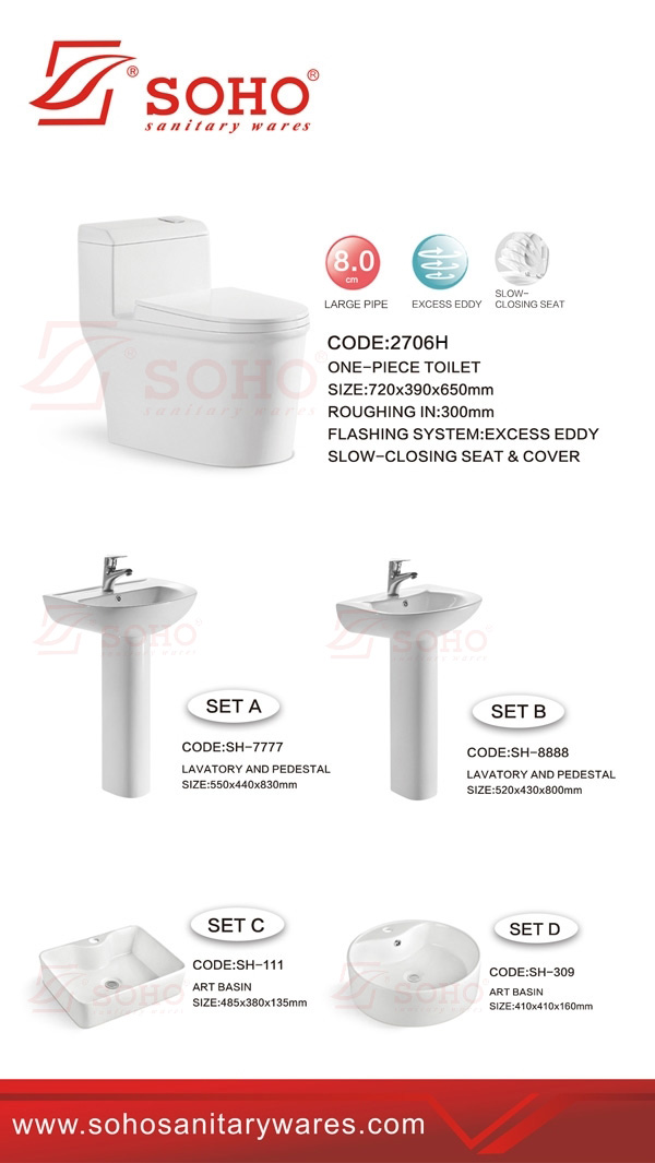 2706H (720*390*650MM) One-piece toilet SET A (550*440*830MM) SH-7777 Lavatory and Pedestal SET B (520*430*800MM) SH-8888 Lavatory and Pedestal SET C (485*380*135MM) SH-111 Art basin SET D (410*410*160MM) SH-309 Art basin