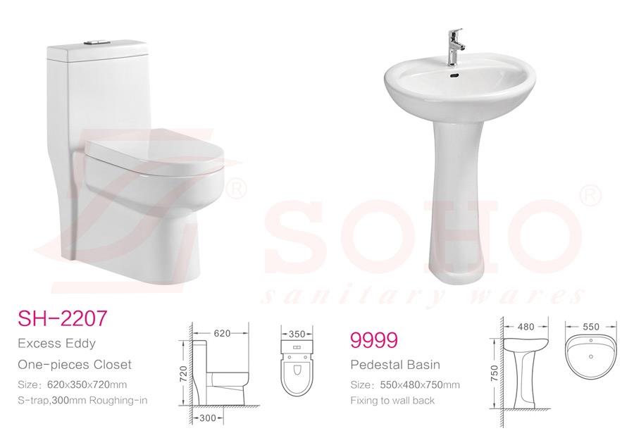 SH-2207 Excess Eddy One-pieces Closet 620*350*720MM S-trap:300mm roughing-in 9999 Pedestal Basin 550*480*750MM Fixing to wall back