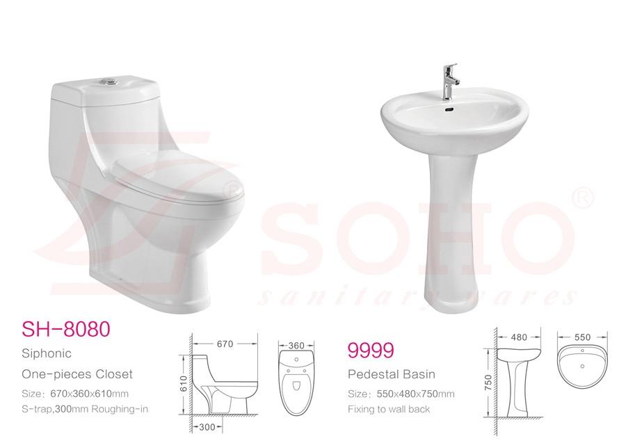 SH-8080 Siphonic One-pieces Closet 670*360*610MM S-trap:300mm roughing-in 9999 Pedestal Basin 550*480*750MM Fixing to wall back